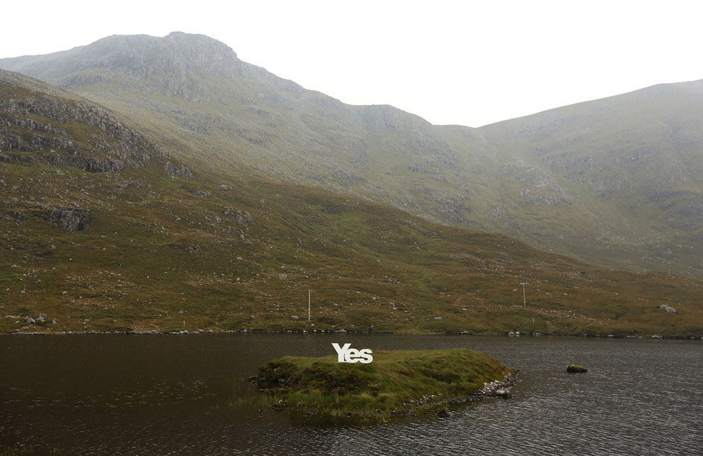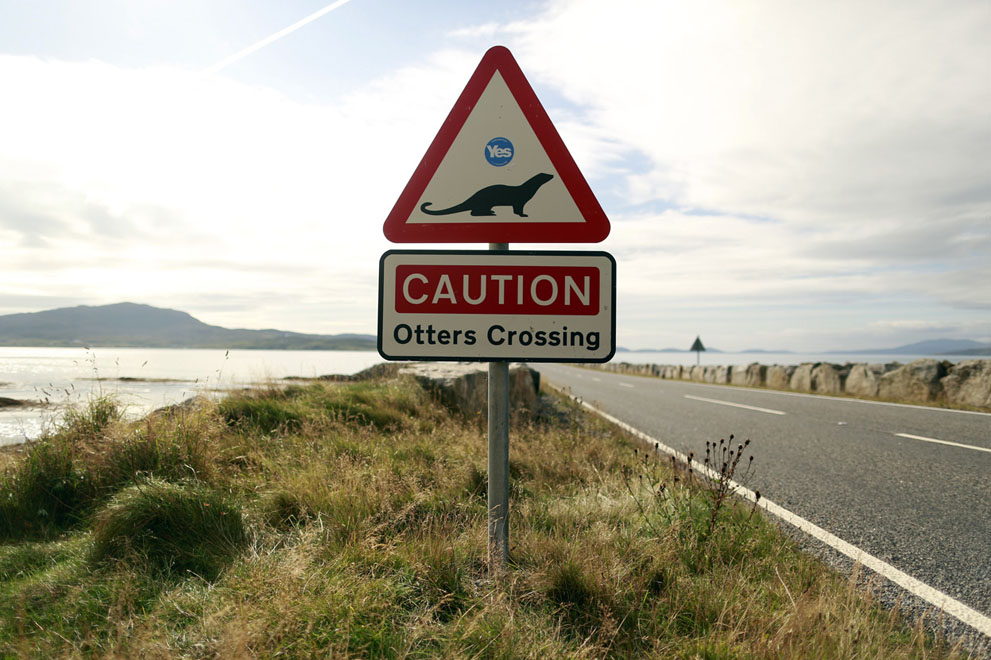 2014年9月16日,在外赫布里底群岛的北尤伊斯特岛公路标志牌上,出现支持苏格兰独立的“Yes”标志。