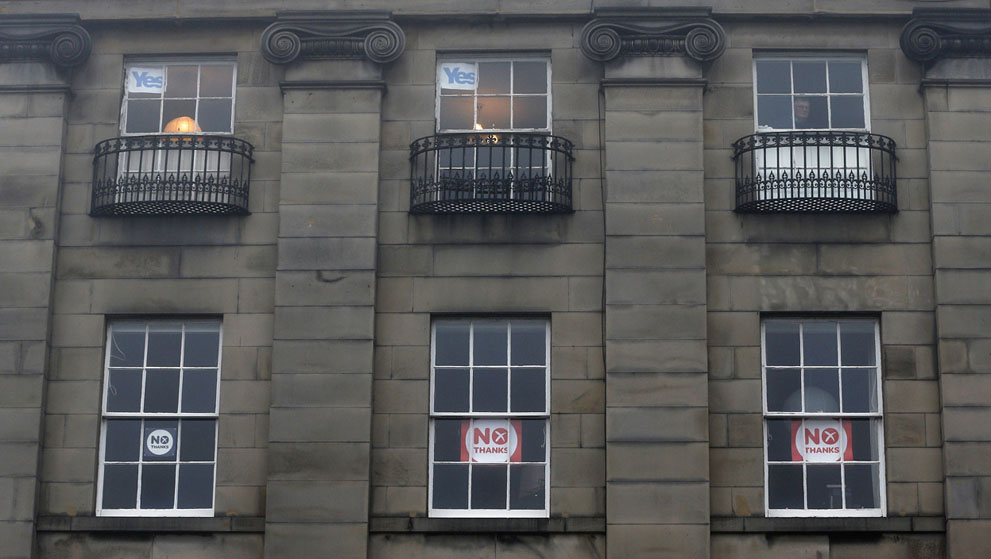 2014年9月15日,苏格兰爱丁堡街头的窗户上可以看到支持和反对独立的标志。