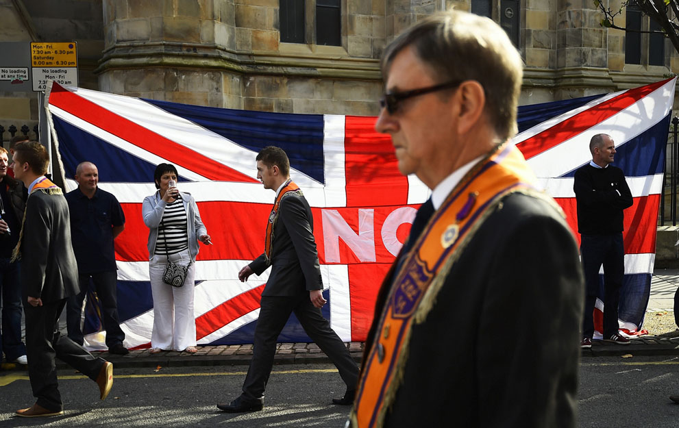 2014年9月13日,在苏格兰爱丁堡反对独立集会上,支持英联邦的人经过一面英国国旗。当天,有来自北爱尔兰和苏格兰的12000名反独立抗议者参加游行,他们穿过爱丁堡市中心,以示支持苏格兰留在英联邦中。