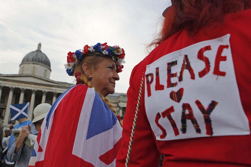 2014年9月15日,支持苏格兰留在英联邦中的人们在伦敦特拉法尔加广场上举行集会。当天,数千人在伦敦参加集会,呼吁苏格兰选民反对独立,留在英联邦中。特拉法尔加广场上的示威者挥舞英国国旗,高喊“我们在一起”、“苏格兰我们爱你,不要离开”等口号。