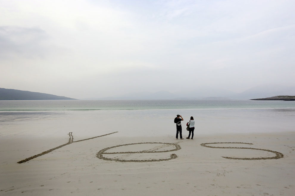 2014年9月12日,外赫布里底群岛的哈里斯岛Luskentyre海滩上,有人写下了一个大大的“Yes”,支持苏格兰独立。
