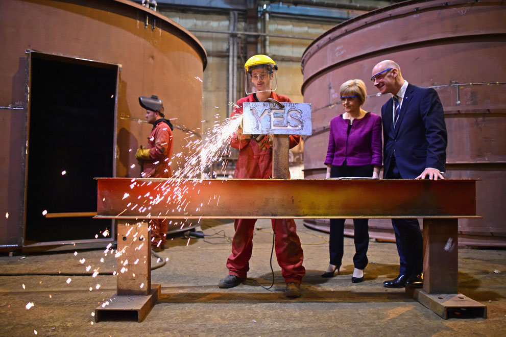 2014年9月16日,苏格兰首席副部长尼科拉·斯特金(Nicola Sturgeon)与苏格兰政府财政事务大臣约翰·斯文尼(John Swinney)视察工程钢材公司,看着19岁的学徒克雷格·麦基(Craig McKee)打造支持独立的“Yes”标志。