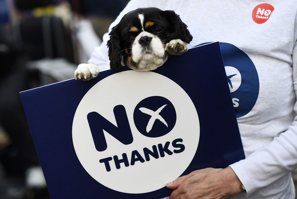 2014年9月14日,苏格兰卡特酒吧靠近英格兰边境的护栏上出现反对独立的标志——“不要独立,谢谢”(No Thanks)。