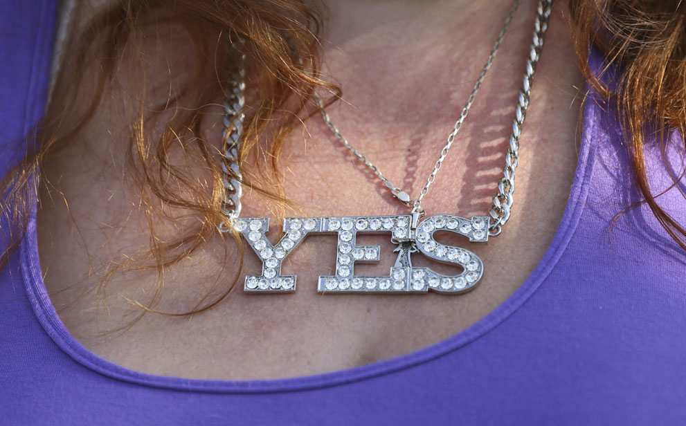 2014年9月10日,苏格兰首席大臣萨蒙德在爱丁堡举行集会,独立运动的支持者展示她的项链。