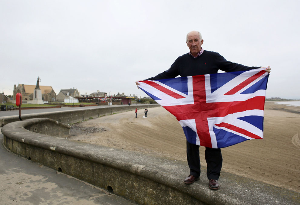 2014年9月15日,在苏格兰艾尔郡(Ayrshire)的特伦海滩上,反对苏格兰独立的选民、退休化工厂经理肯·布朗(Ken Brown)高举英国国旗。布朗说:“我认为作为一个国家,我们最好成为一体,不分离。”