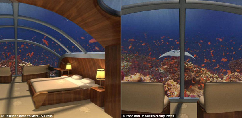自海岸乘坐电梯可进入水下,该酒店为顾客提供极尽的服务,每间套房都配有水流按摩浴缸、海景展示窗。每间套房外围70%的面积都有亚克力材质包装,内部还装有调光灯以及给料机,令顾客能够充分感受精致诱人的海洋景观。