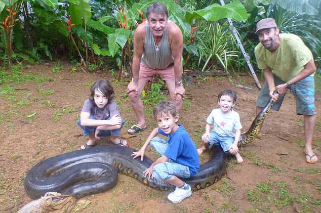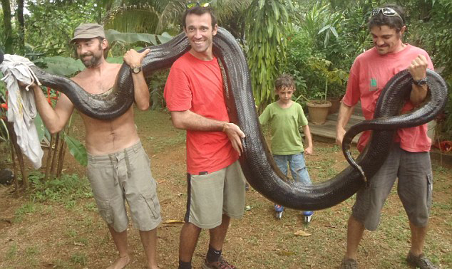 英国《每日邮报》9月18日刊发的照片显示,圭亚那一名教师发现了一条17英寸的蟒蛇,并将其头部罩住从河中打捞到岸上,在此之前,这条蟒蛇吞下了一条狗。图为这名教师和朋友一起与蟒蛇合影。