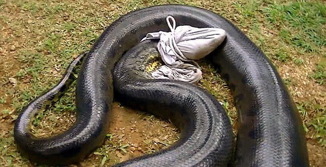 英国《每日邮报》9月18日刊发的照片显示,圭亚那一名教师发现了一条17英寸的蟒蛇,并将其头部罩住从河中打捞到岸上,在此之前,这条蟒蛇吞下了一条狗。