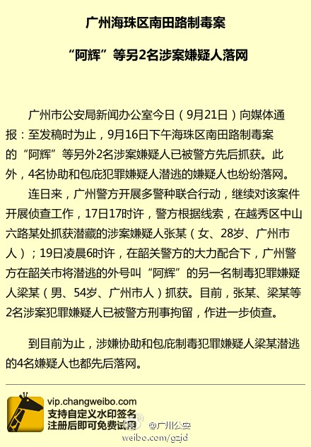 广州公安:#警方通报#【海珠区南田路制毒案“阿辉”等另2名涉案嫌疑人落网】连日来,广州警方继续对9月16日海珠区南田路制毒案开展侦查工作,并于17日在越秀区抓获潜藏的涉案嫌疑人张某,19日在韶关警方的配合下抓获外号“阿辉”的另一名制毒犯罪嫌疑人梁某。目前,涉嫌协助和包庇梁某潜逃的4名嫌疑人都先后落网。以下为详文: