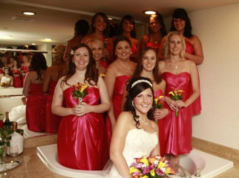 在这些照片中,摄影师们可谓想尽“损”招让新娘和伴娘们“出丑”。在其中一张照片中,新娘和伴娘们被要求集体站在热水浴缸中,只露出上半身,姿势滑稽可笑。另外一些照片中,伴娘新娘持枪“上阵”,让人惊讶之余,更是忍俊不禁。还有的照片中,伴娘伴郎们则集体站在超市过道里,似乎走错了“婚礼通道”,充满了喜感。(米粒)