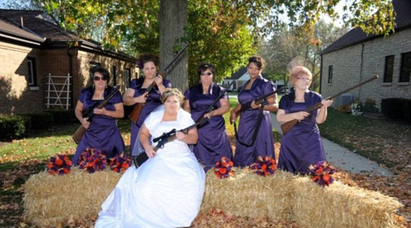 新娘和伴娘们持枪上阵,完美演绎“枪口下的婚礼”。(网页截图)