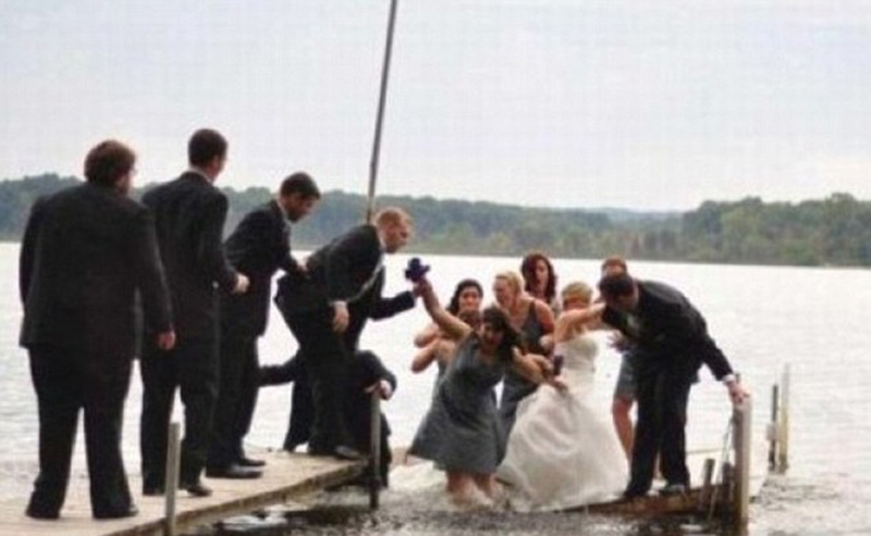掉到湖中的新娘和伴娘们。(网页截图)