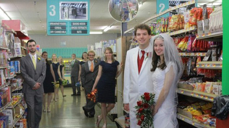 这对新人似乎走错了“婚礼通道”,来到了超市。(网页截图)