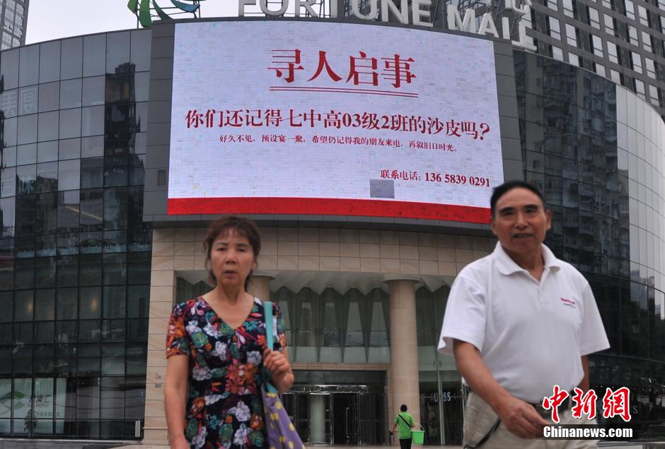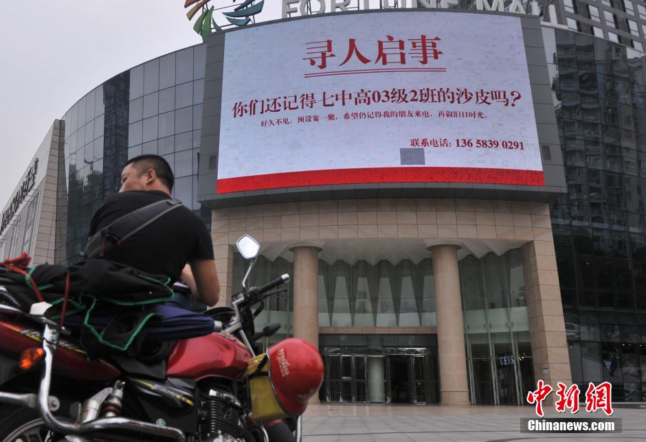 近日,重庆一商业街液晶大屏幕上和一公交车站台广告栏登了一则巨幅“寻人启事”,上面写着:“你们还记得7中高03级2班的沙皮吗,好久不见,预设宴一聚,希望仍记得我的朋友来电,再叙旧日时光”。陈超 摄