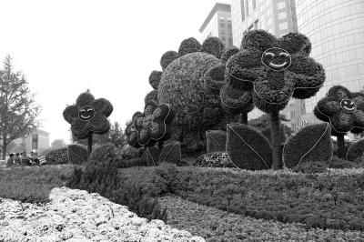 国庆来临,东单路口西北角的花坛搭建基本完成。京华时报记者徐晓帆摄