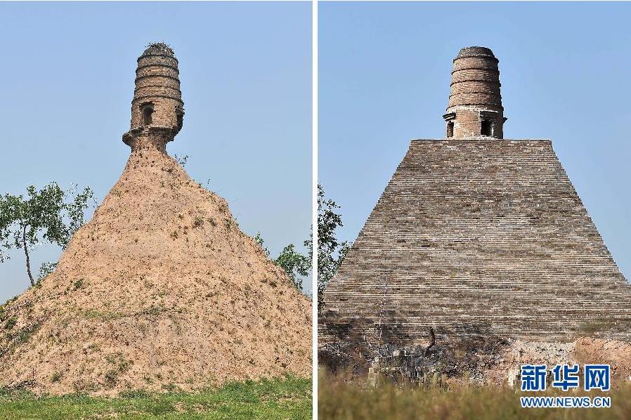 左图:修缮前的祁县“塔坚强”(7月28日摄);右图:“塔坚强”修缮工程进展顺利,塔基已修建完成(9月24日摄)(拼版照片)。
