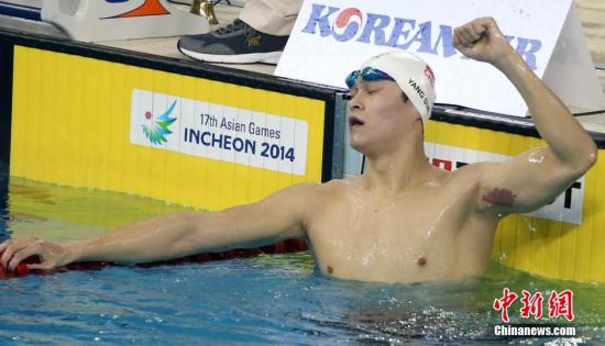 9月26日,仁川亚运会游泳比赛继续在文鹤朴泰桓游泳馆举行。中国选手孙杨以14分49秒75勇夺男子1500米自由泳金牌。中新社记者 汤彦俊 摄