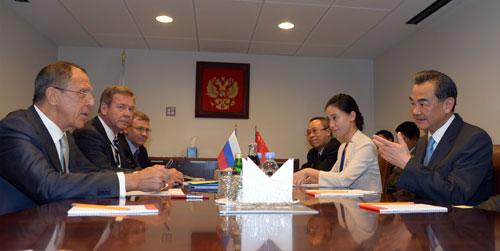 中新网9月27日电 2014年9月26日,外交部长王毅在出席联大期间会见俄罗斯外长拉夫罗夫。王毅表示,中方愿与俄方继续保持在联合国、上海合作组织、金砖国家、俄中印等多边机制内的战略协作,推动伊拉克、伊朗核、乌克兰等当前国际和地区热点问题的妥善解决。