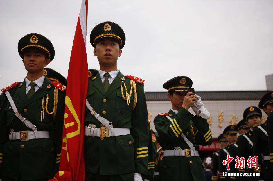 9月30日,北京高校国旗班的学生等待阅兵仪式开始。中新社发 王骏 摄