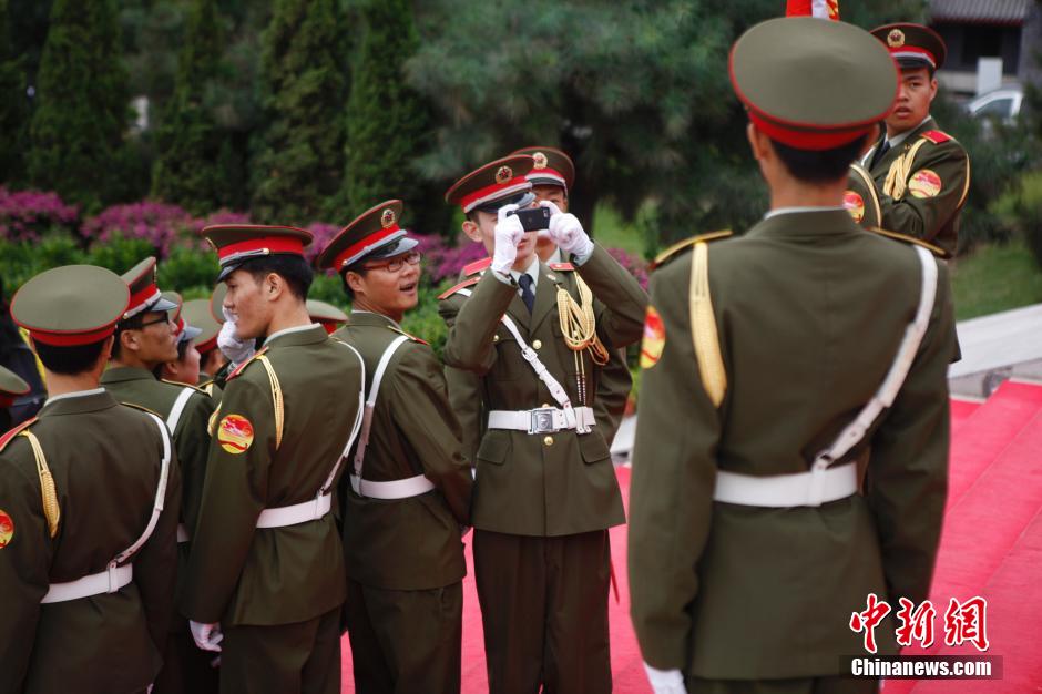 9月30日,北京某高校的国旗班学生在仪式结束后拍照留念。中新社发 王骏 摄