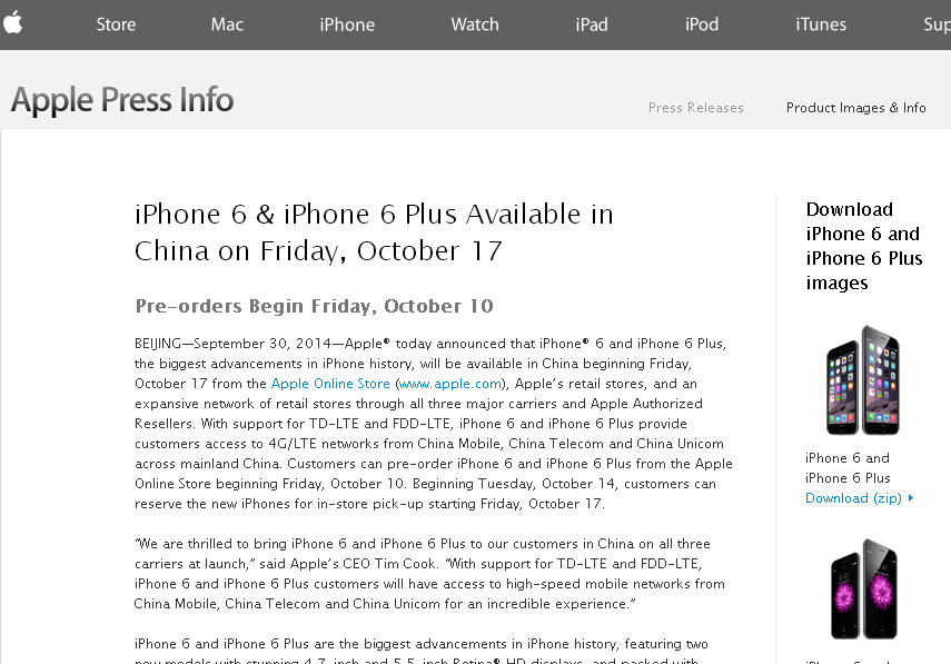 原标题: 苹果宣布iPhone6将于10月17日在中国内地上市