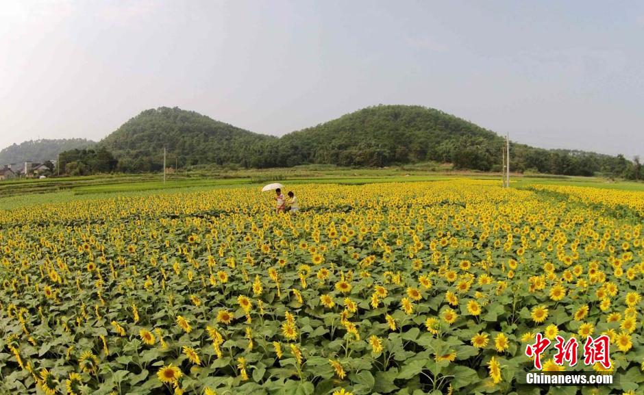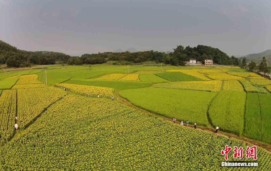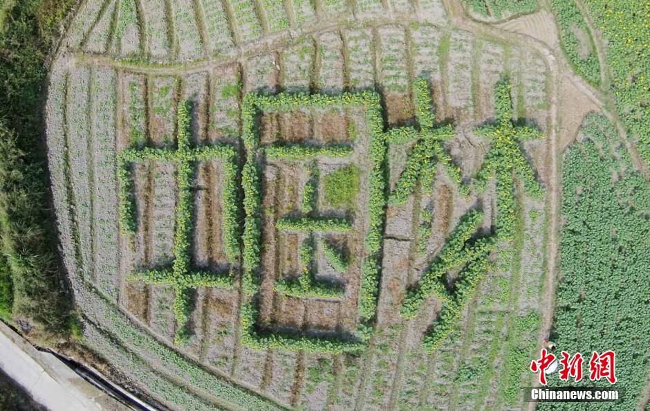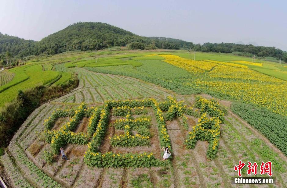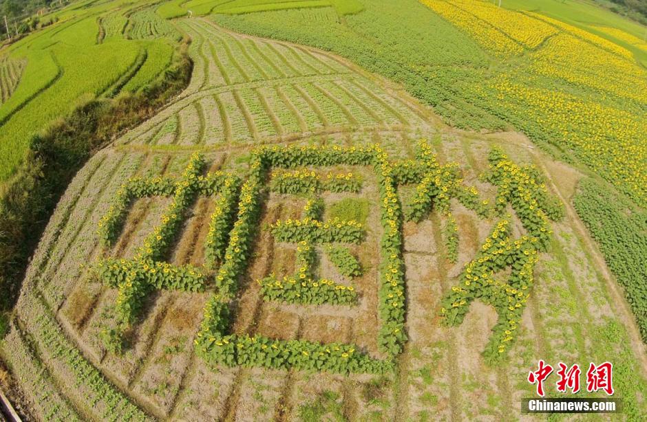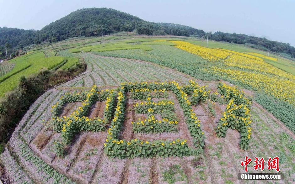 10月1日,是中华人民共和国第65个国庆节。在偏远山区的广西柳州市融安县大良镇西村,当地农民种植油葵,设计成“中国梦”字样,以此庆祝国庆节,花期恰逢国庆节,吸引了大量游客前来观赏。图为广西柳州市融安县大良镇西村航拍的“中国梦”字样油葵花田。谭凯兴 摄