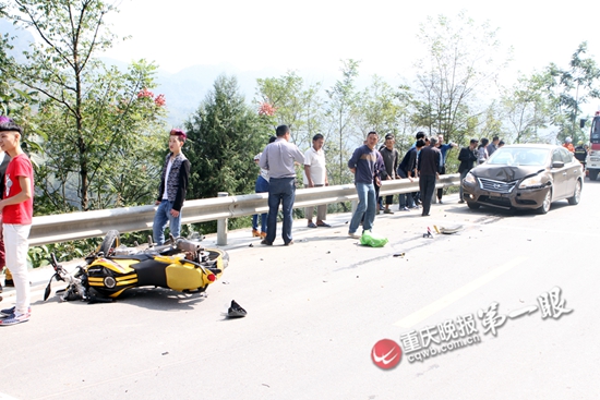 (重庆晚报第一眼网站首席记者 夏祥洲 通讯员 钟圣文 10月5日20:58报道)今日(5日)中午,黔江区中塘乡往小南海镇方向龙桥洞路段,发生一起交通事故,一辆摩托车在超车过程中,由于车速过快避让不及,撞上了一辆在逆向行驶的轿车,摩托车被撞飞5米开外,摩托车驾驶员坠入约十米深谷。
