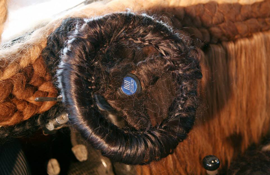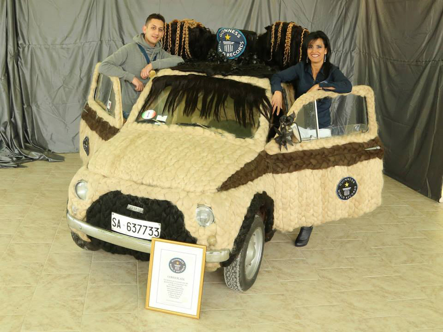 国际在线专稿:据美国Odditycentral网站10月8日报道,世界之大,无奇不有。为向自己的职业致敬,意大利44岁的女发型师玛利亚·露西亚·马格诺(Maria Lucia Mugno)将自己的爱车全身“缝”上了人类的头发,为爱车赢得了 “世界上头发最多的车”的吉尼斯世界纪录称号。