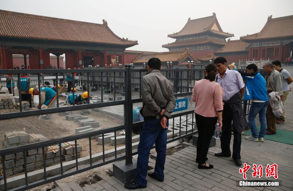 10月10日,北京故宫正在进行的乾清门广场地面铺墁施工作业吸引了游客目光。这次施工首次尝试把工地设置为半开放展示空间,让游客能够领略到传统修缮工艺的精妙。当日是北京故宫建院89周年纪念日,北京故宫近期通过御花园景观环境提升、拆除彩钢房和临时建筑、修缮乾清门广场地面等方式庆祝自己的生日。中新社发 刘关关 摄