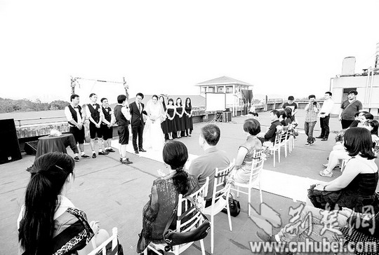 6日下午五点半,武汉大学枫园某栋学生宿舍的天台上,简易的舞台布置妥当,新郎带着伴郎跳起欢快的《小苹果》,开始了这场婚礼仪式。