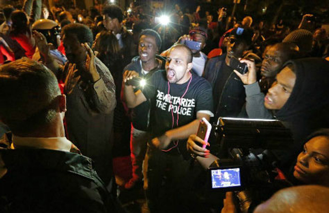 11日,更多示威者涌入圣路易斯市中心,他们来自美国纽约、威斯康星以及附近各州。活动组织者向示威人群发表讲话,要求美国检方对枪杀黑人青年的白人警察提出指控。