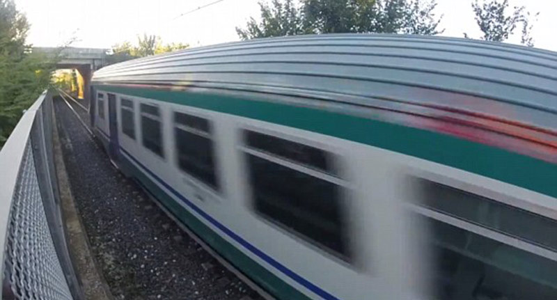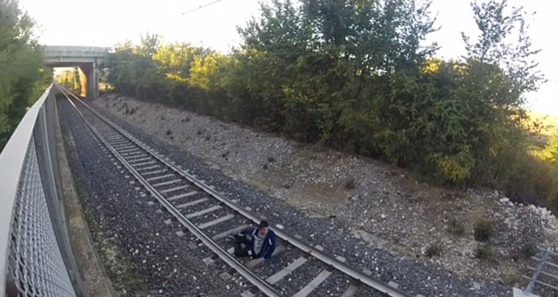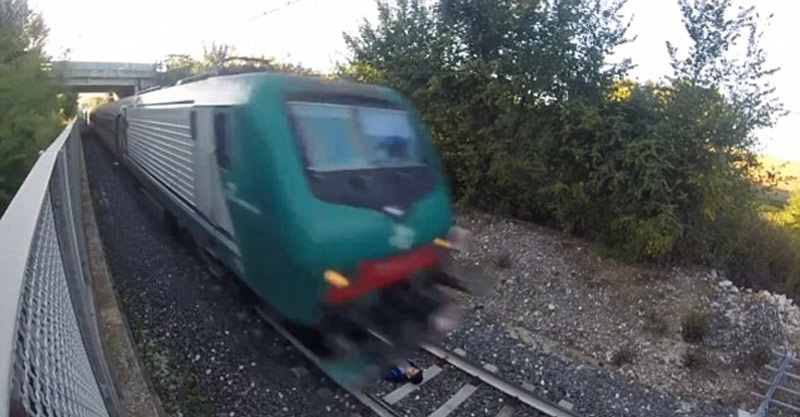 国际在线消息:据外媒报道,在意大利中部的翁布里亚地区,一个男孩在火车轰鸣而过的时候躺在铁轨上纹丝不动,而且还兴致盎然的拍下了自己卧轨的挑战过程。
