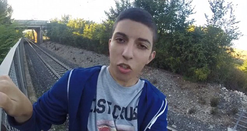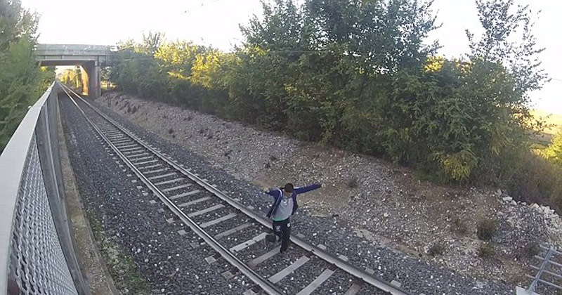 当时,一列火车正从远处呼啸而来,男孩躺在铁轨上,现场录像清晰地记录下了火车即将从他身上碾过的一刹那。之后,男孩毫发无损站起身来,对着火车驶去的方向挥舞双臂,庆祝自己的“胜利”。