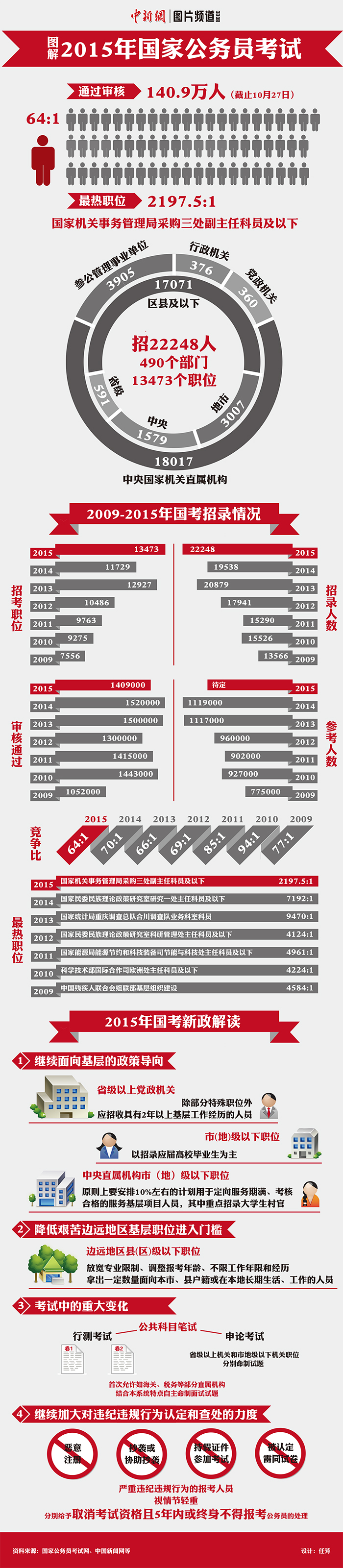 2015年国家公务员考试报名资格审查10月26日结束,国家公务员局公布,此次报名共有140.9万人通过资格审查,比去年少了11.5万人。据了解,今年的招录职位人数为2.2万人,竞争比为64:1,也就是平均64个人竞争1个职位,相比去年77:1明显下降。