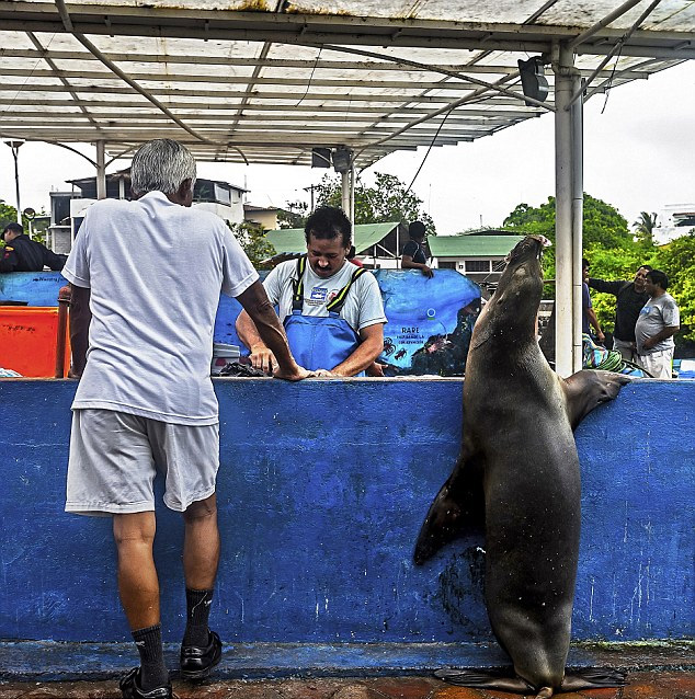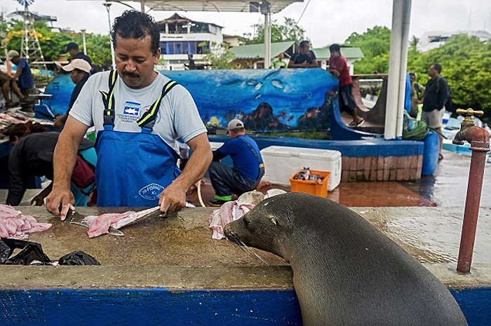 国际在线消息:据英国《每日邮报》报道,游客近日在南美洲厄瓜多尔的圣塔克鲁斯岛发现了有意思的一幕 ,一只海狮成了当地鱼摊的一名“常客”。