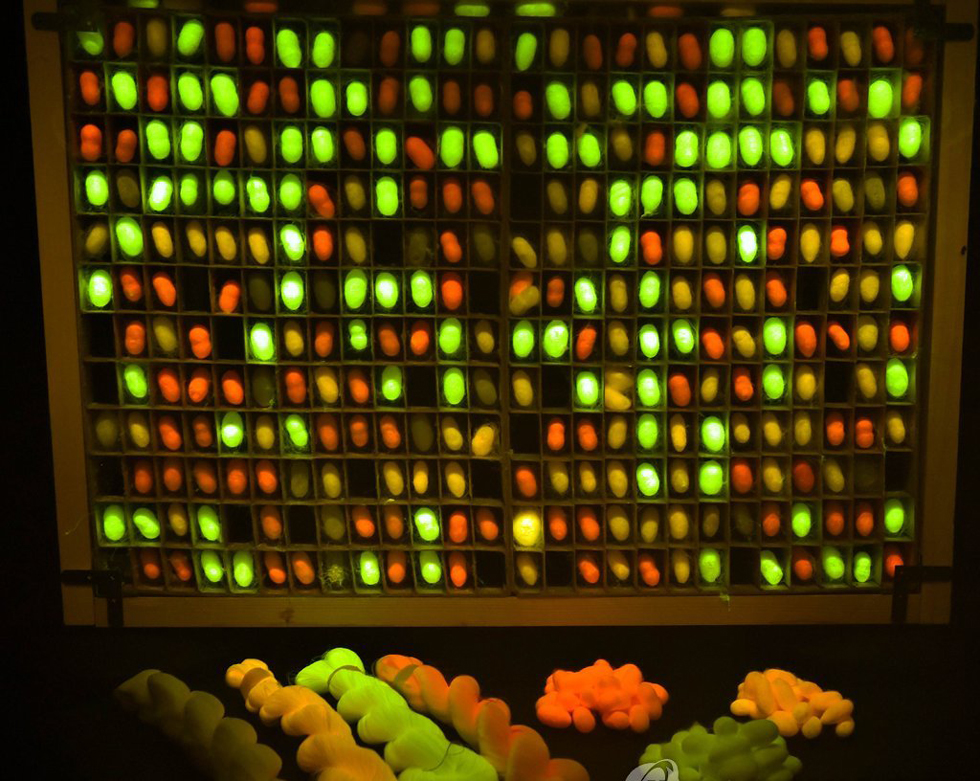 发光丝绸是用基因重组技术培育出的特殊的蚕所吐的丝织造而成(网页截图)