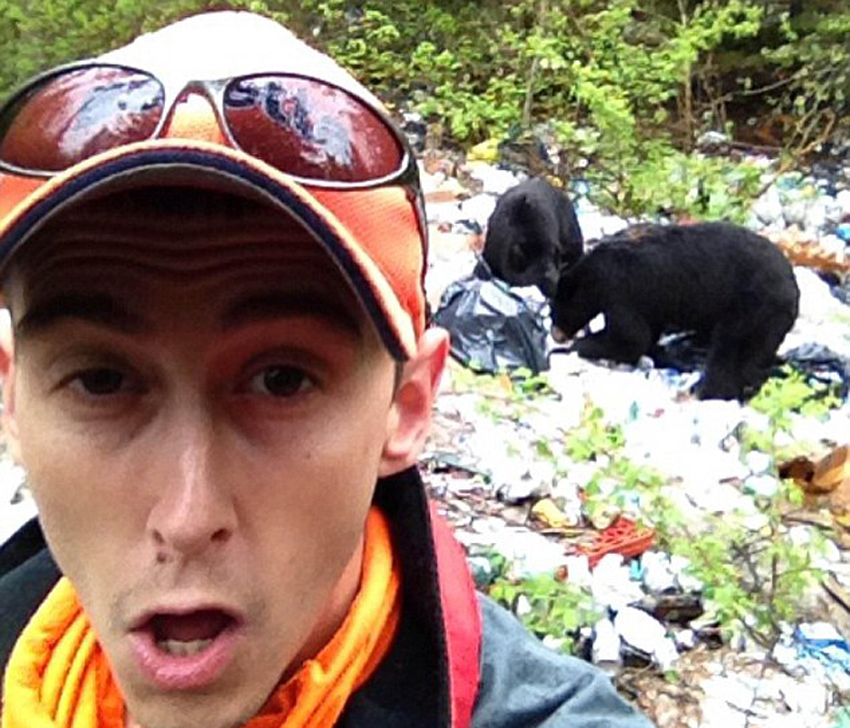 两只黑熊正在垃圾场中翻捡食物,这名男子抓住机会与它们自拍。(网页截图)