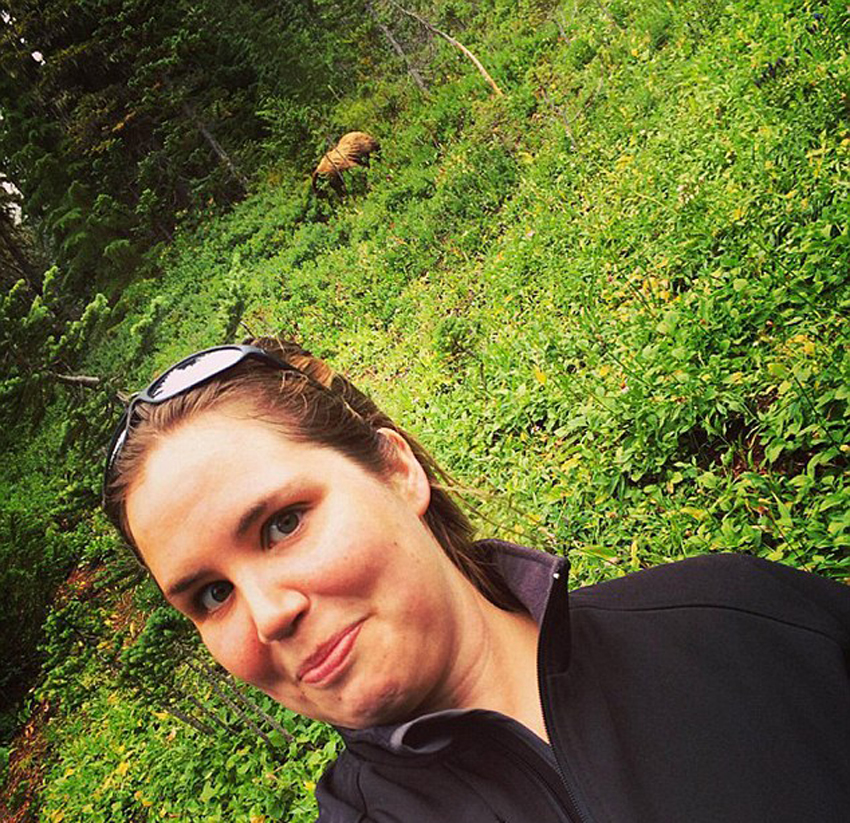 当这名女子对着摄像头微笑时,一只熊正从后面的灌木丛中穿过。(网页截图)