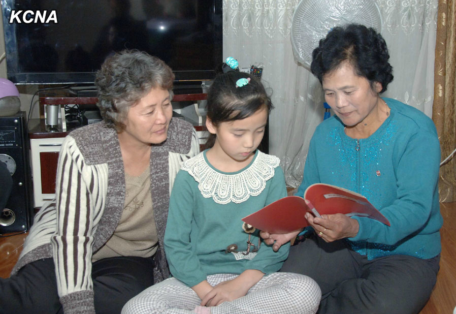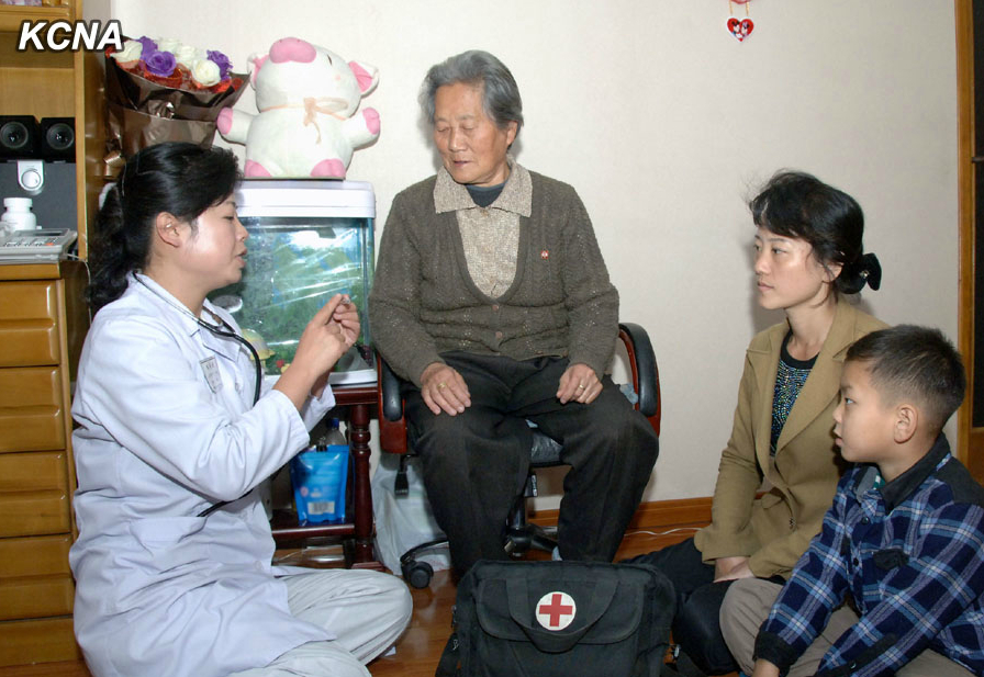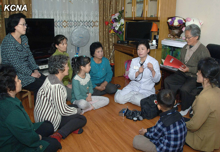 医务人员走入群众家里宣传卫生常识(图片来源:朝中社)