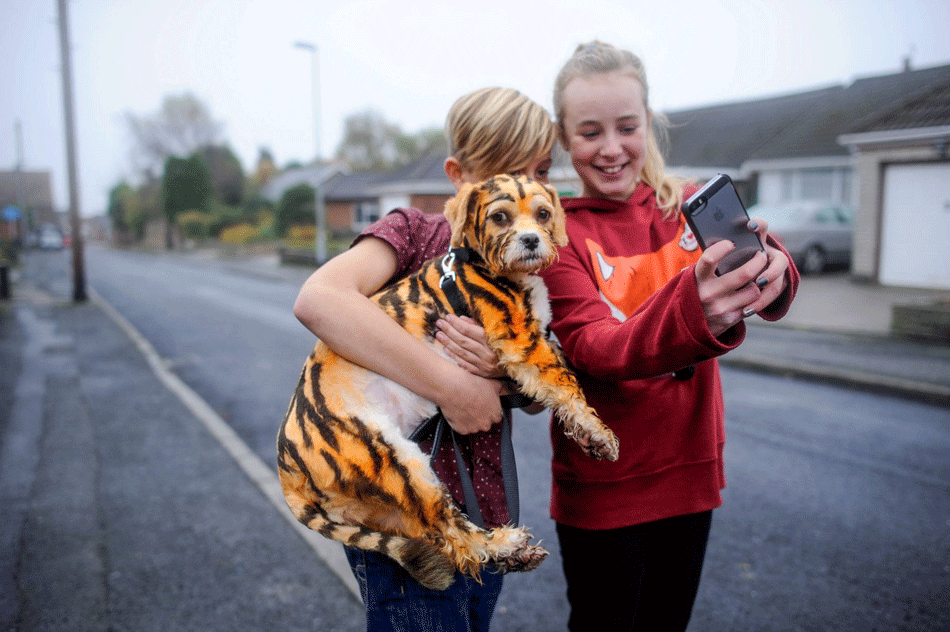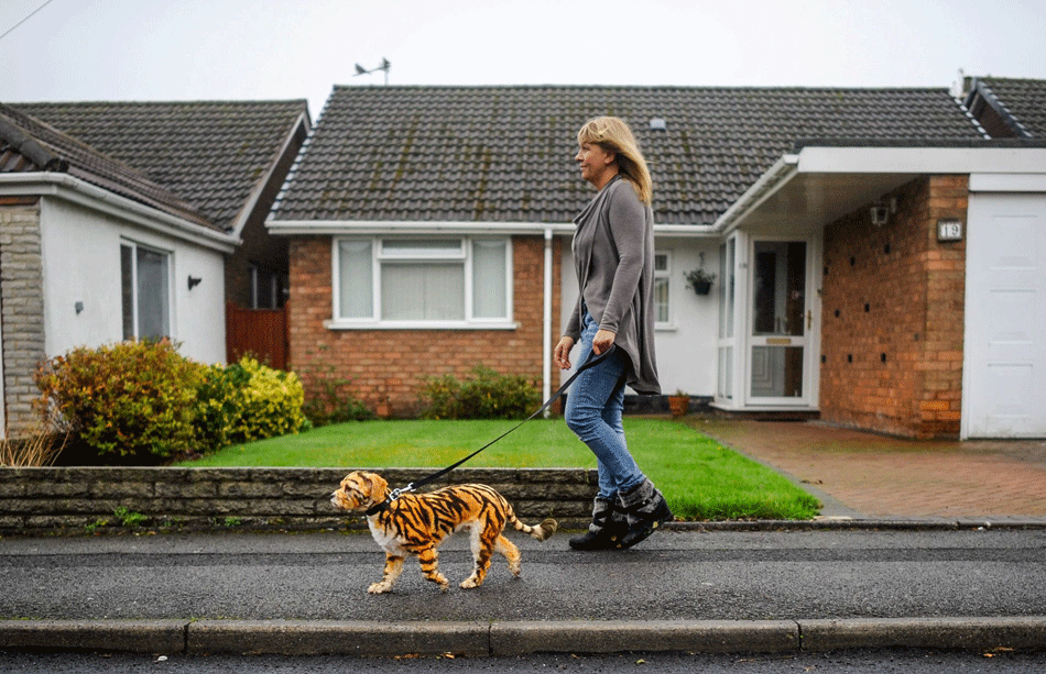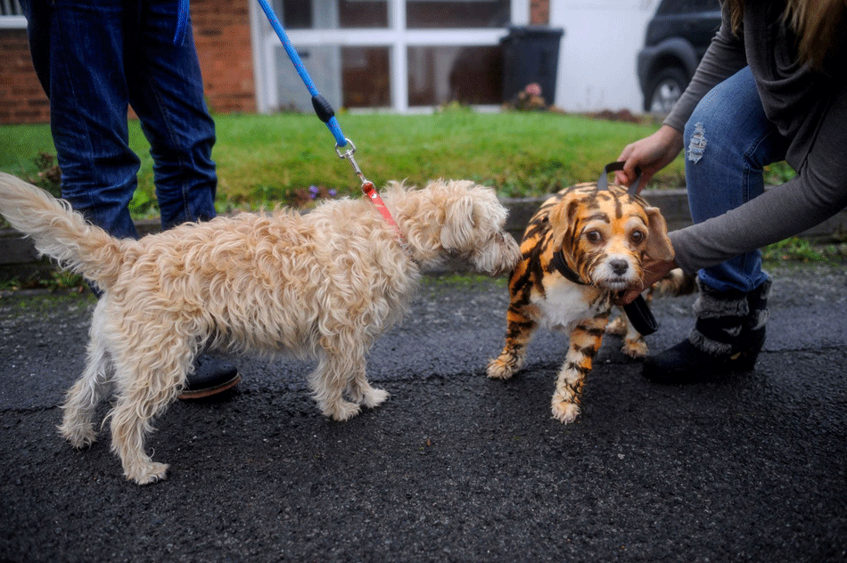 国际在线专稿:据英国《每日记事报》11月1日报道,英国一女子日前用特殊染料将自己的宠物小狗全身涂满老虎斑纹,俨然一只小老虎。在她领着“小老虎”外出散步时,路人纷纷聚拢过来,为其拍照。