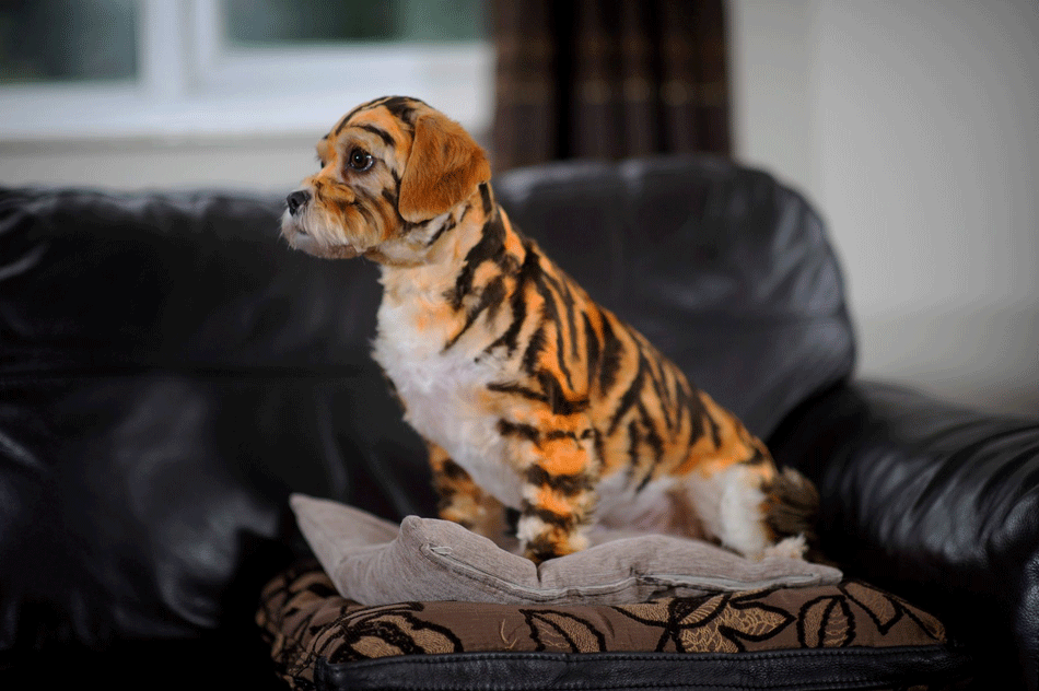 英国女子杰基·西蒙兹用特殊染料将自己的宠物小狗全身涂满老虎斑纹。(网页截图)