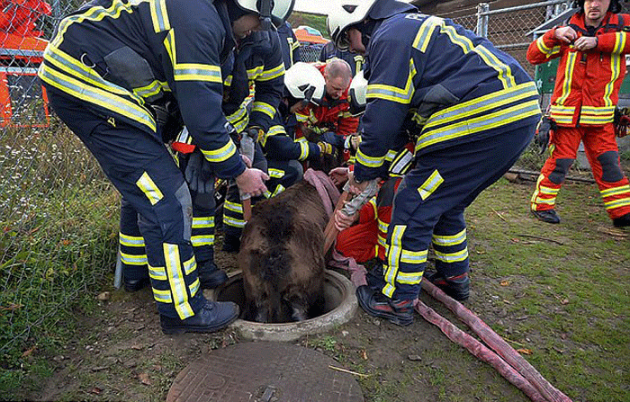 10余名消防员围在尼洛周围,合力将其救出。(网页截图)