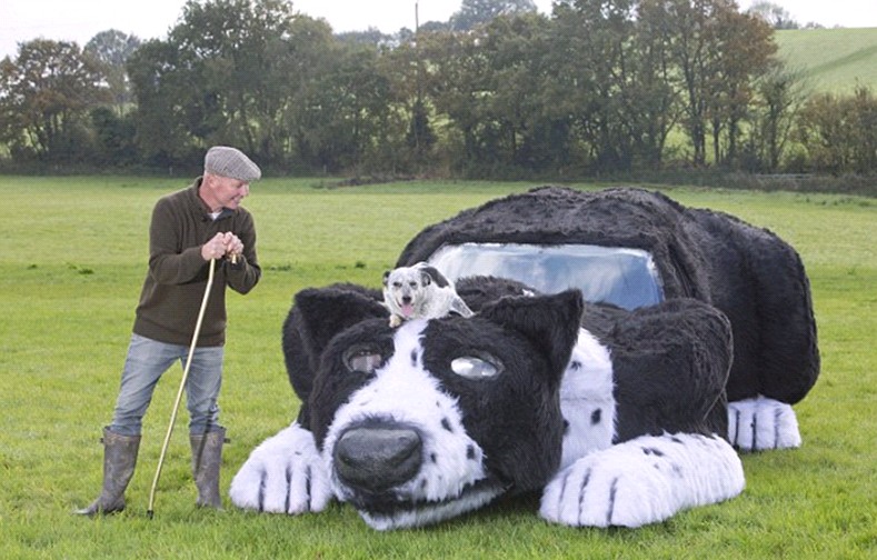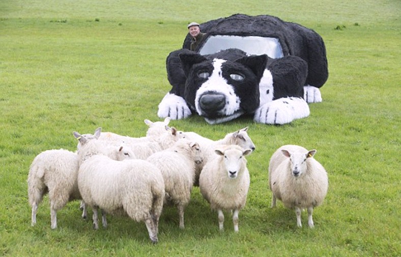 (46岁英国农民艾萨克花费2000英镑改装标致汽车,将其变成牧羊犬的样子。(网页截图) )