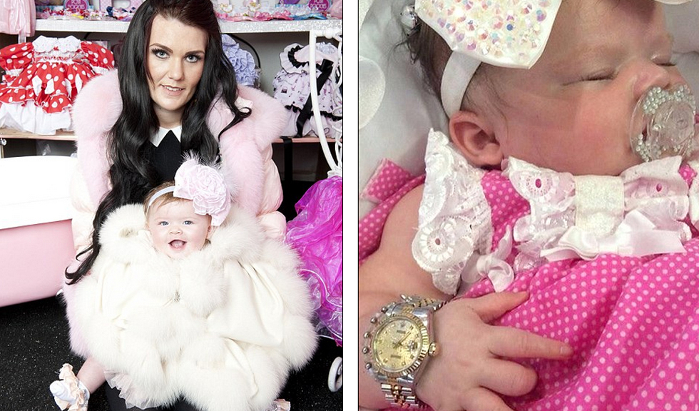 居住在英国普利茅斯市的宝宝洛美尼·罗兰(Romany Rose Rowland)虽然只有5个月大,但她的衣橱已经塞满了各种名贵衣裙、饰品,其中包括价值近8000元的钻石耳环、近2.7万元的劳力士手表,约1500多元的古奇名牌包。外出时,拥有9辆婴儿车“座驾”的她一定会“挑选”出最搭配其当天服饰的一辆出外。另外,如果天气冷的话,她会围上一条价值1800多元的山羊绒围巾,戴上皮帽,派头十足。