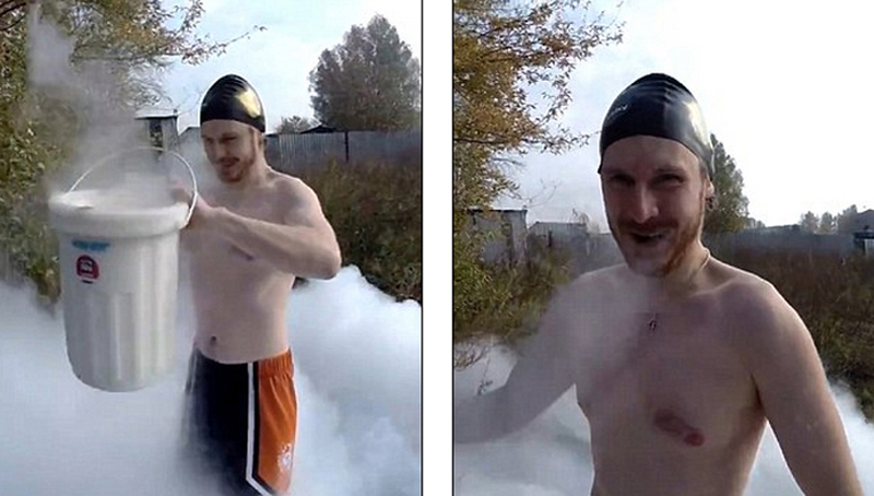 俄罗斯34岁科学家安东·科诺瓦洛夫(Anton Konovalov)在克拉斯诺亚尔斯克州(Krasnoyarsk Oblast)一家液氮生产化工厂工作。在视频中,科诺瓦洛夫抓起装有液氮的桶,将里面冰冷的液体浇到头上。