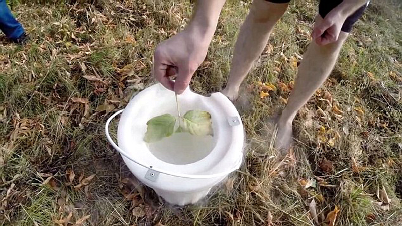 进行挑战之前,科诺瓦洛夫曾从附近折下带有树叶的树枝,并将其伸入液氮桶中,树叶立即被冻结。用手碰触后,这些冰冻树叶立即碎裂成渣。(网页截图)