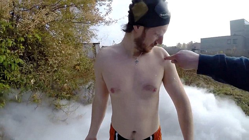 在此之前,科诺瓦洛夫曾从附近折下带有树叶的树枝,并将其伸入液氮桶中,树叶立即被冻结。用手碰触后,这些冰冻树叶立即碎裂成渣。但是当液氮浇到头上后,科诺瓦洛夫没有被冻成冰人,他只是简单地摇了摇头。科诺瓦洛夫承认,液氮很冷,但他依然能挺住。