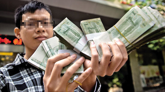 陈先生手持大量一元人民币准备去银行开存折 羊城晚报记者 周巍 摄