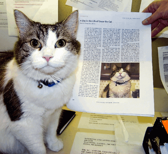 它的事迹首先被布朗大学老年病学专家、副教授大卫 杜莎(David Dosa)博士发现。杜莎博士称:“过去的6年里,奥斯卡的预测几乎从未失误。这绝对不是单纯的巧合。”最后,杜莎博士根据自己与奥斯卡在疗养院的经历撰写了一本书——《预知生死的猫:奥斯卡》,主要介绍奥斯卡会选择特定的病人,陪在其左右。而这些病人通常会在短时间内死亡。即使被关在门外,奥斯卡也会在垂死的病人房外抓门,努力进去。但该书并未就这种“超能力”给出任何科学的解释。只是说像狗对癌症敏感一样,奥斯卡可能对酮类嗅觉灵敏。而这种酮类恰好是正在死亡的细胞释放出的气味。