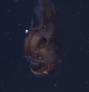 美国研究人员在水下500多米处拍摄到一条雌性黑角安康鱼。(视频截图)